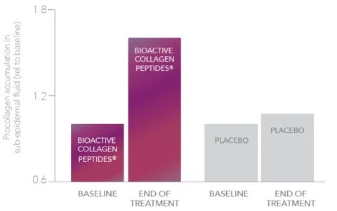 Another study with more than 100 women aged between 45 and 65 years shows that in ingesting the specific Bioactive Collagen Peptides® used in Collagen& (2500mg/day) significantly reduces wrinkles after 4 weeks and leads to a significantly higher skin pro-collagen concentration.